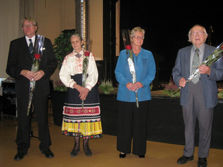 ![]() Seuran 20-vuotisjuhlassa kukitettiin perustajajäsenistä paikalla olleet Eero Lehtonen, Kerttu Högbacka-Stenholm, Ritta Hognerud-Mikkonen ja Kauko Alamäki |